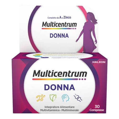 Multicentrun DONNADescrizione Integratore alimentare multivitaminico-multiminerale completo, formulato per soddisfare i fabbisogni nutrizionali delle donne. Con maggiori livelli di vitamina D, importante per un efficiente assorbimento del calcio e per mantenere una concentrazione fisiologica di calcio nel sangue, necessaria per la normale mineralizzazione delle ossa. Con calcio, acido folico e maggiori quantitativi di ferro specifici per supportare le esigenze nutrizionali della donna. Con vitamina C e zinco, per supportare il buon funzionamento del sistema immunitario. Con acido pantotenico, ferro e zinco per aiutare a mant...